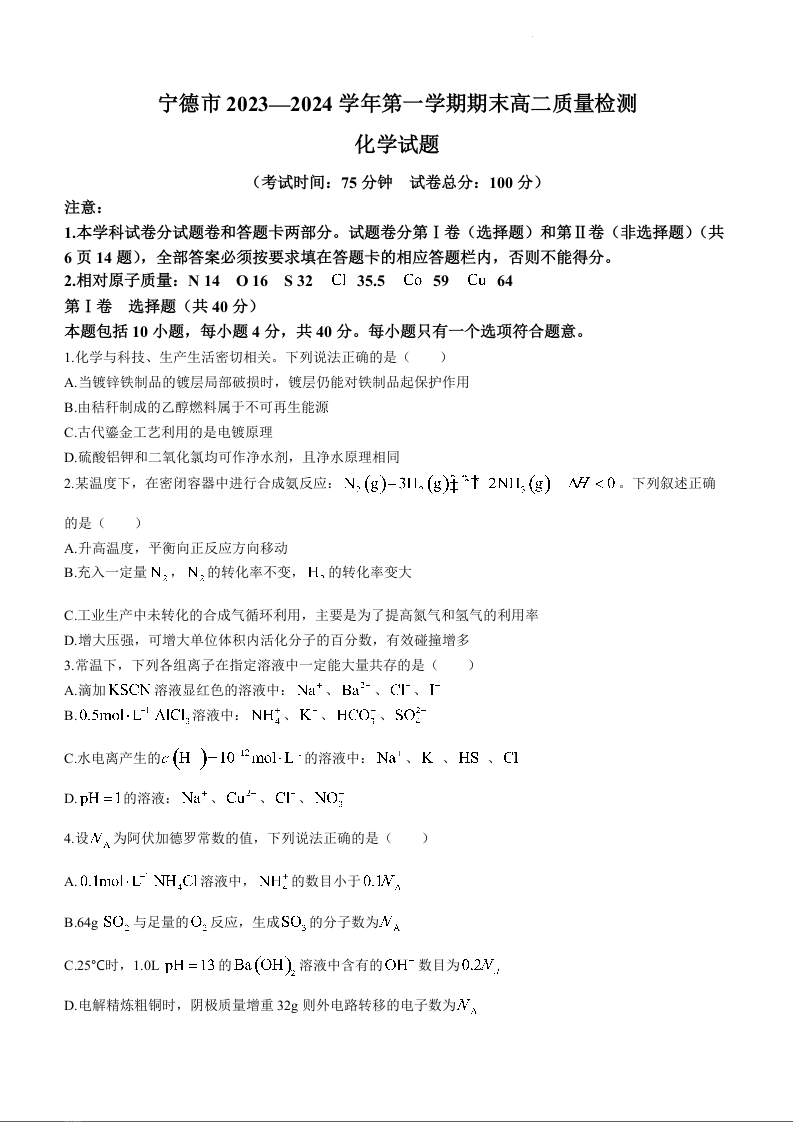 福建省宁德市2023-2024学年高二上学期期末质量检测化学