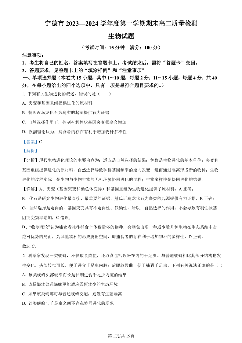 福建省宁德市2023-2024学年高二上学期期末质量检测生物(精品解析版)