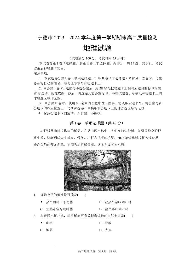 福建省宁德市2023-2024学年高二上学期期末质量检测地理