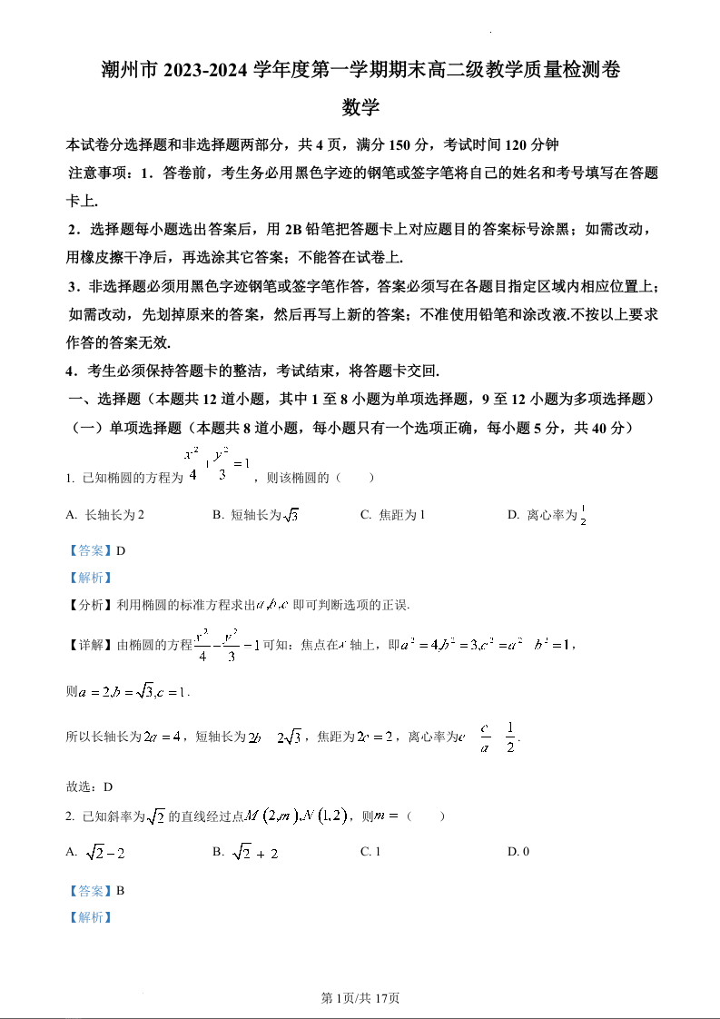 广东省潮州市2023-2024学年高二上学期期末考试数学(精品解析版)