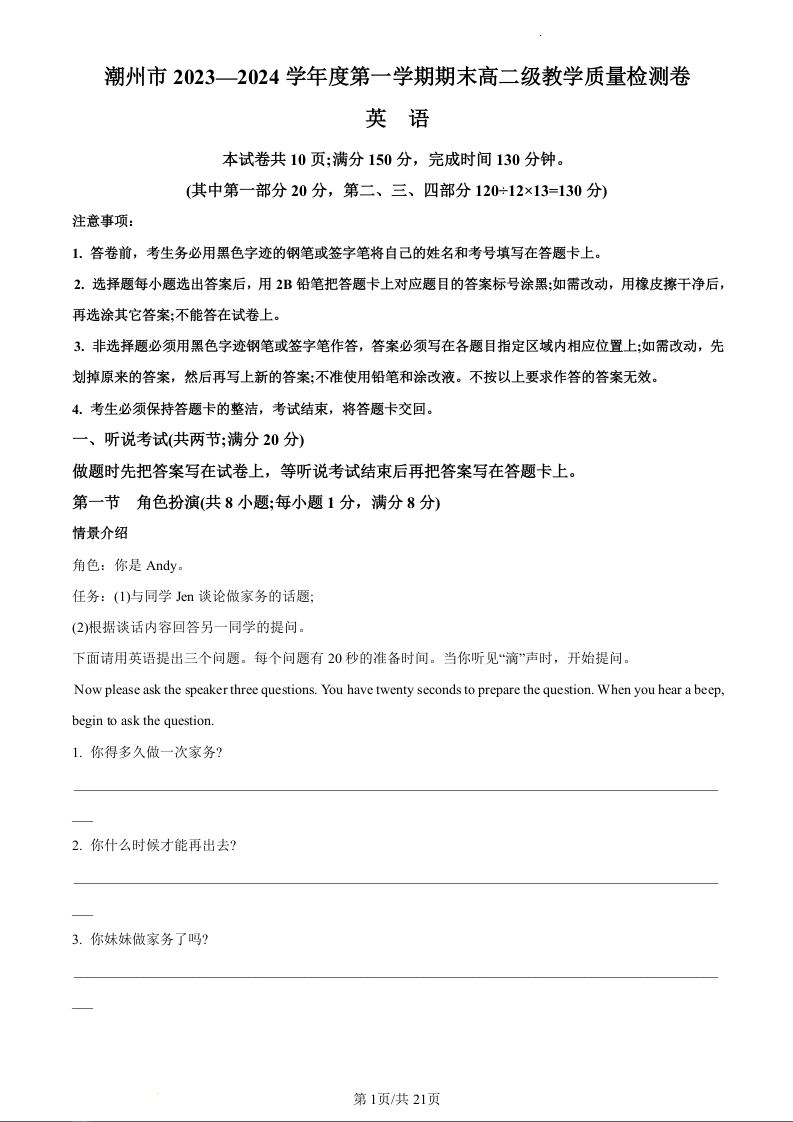 广东省潮州市2023-2024学年高二上学期期末考试英语(精品解析版)