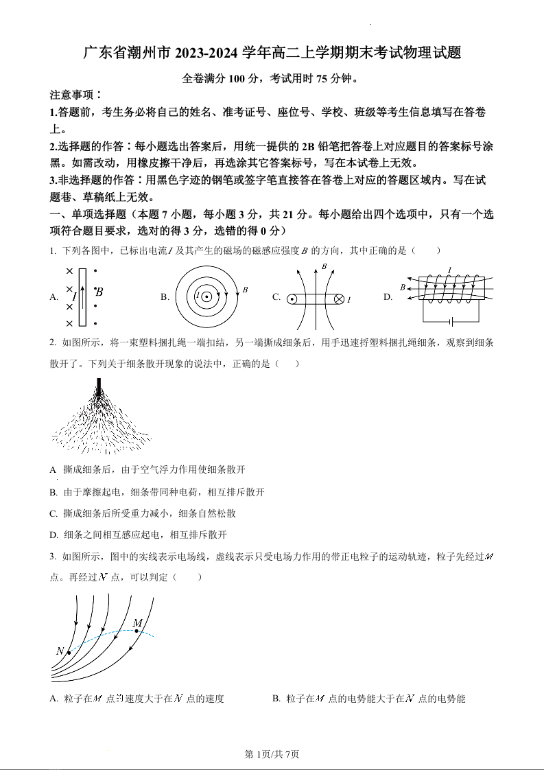 广东省潮州市2023-2024学年高二上学期期末考试物理(原卷版)