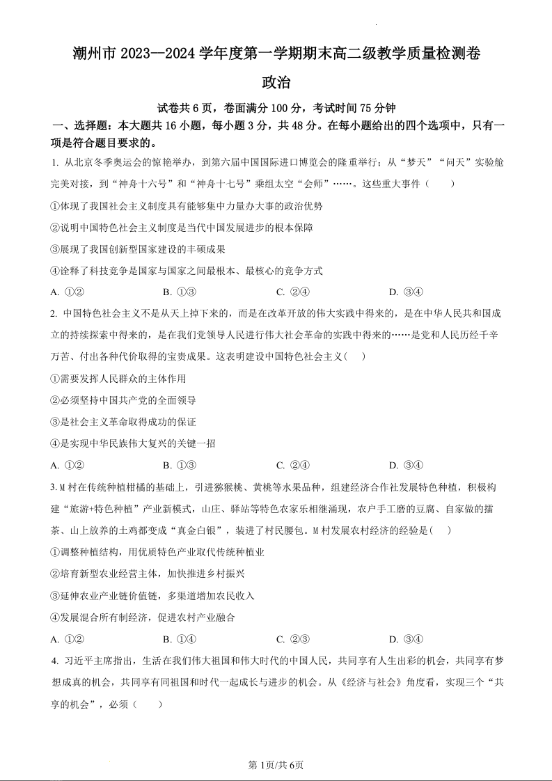 广东省潮州市2023-2024学年高二上学期期末考试政治(原卷版)