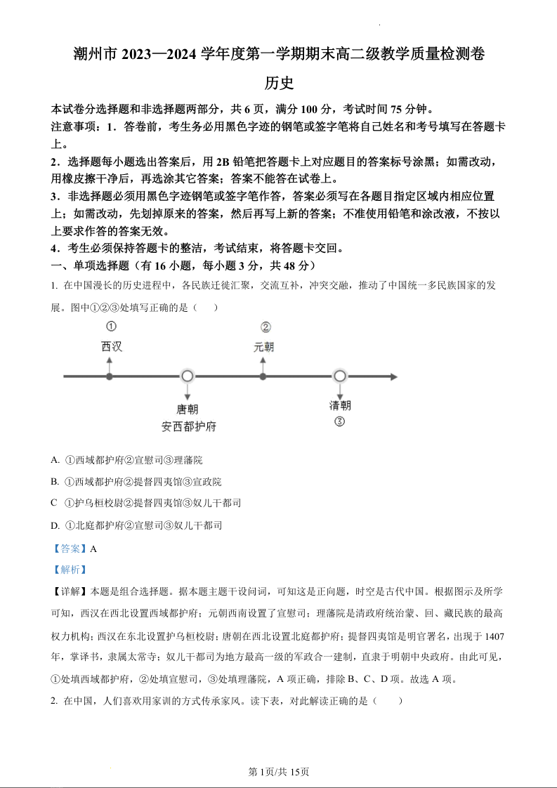 广东省潮州市2023-2024学年高二上学期期末考试历史(精品解析版)