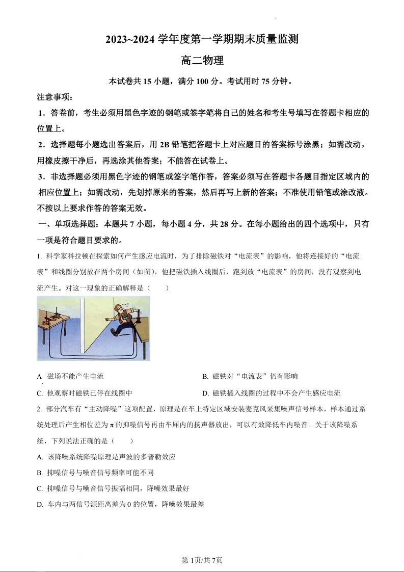 广东省茂名市电白区2023-2024学年高二上学期期末质量监测物理(原卷版)