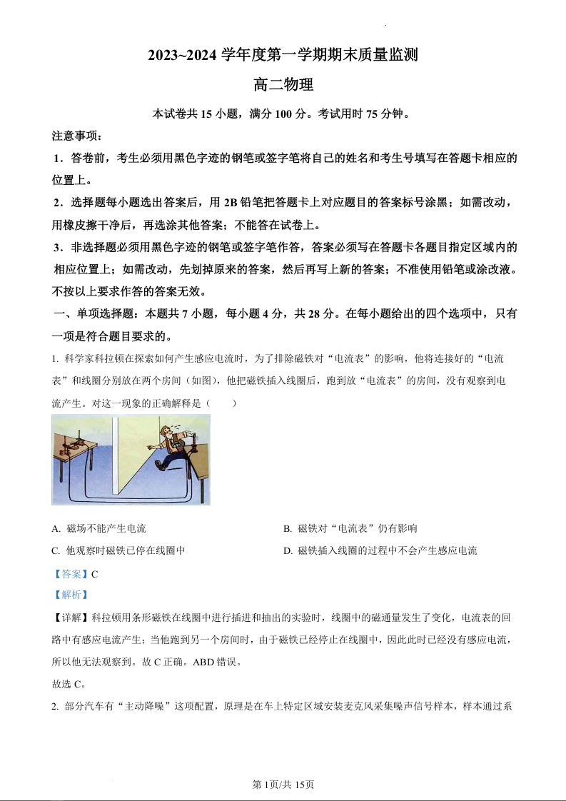 广东省茂名市电白区2023-2024学年高二上学期期末质量监测物理(精品解析版)