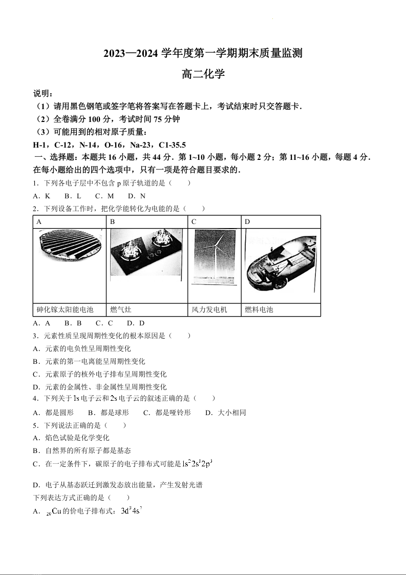 广东省茂名市电白区2023-2024学年高二上学期期末质量监测化学+答案