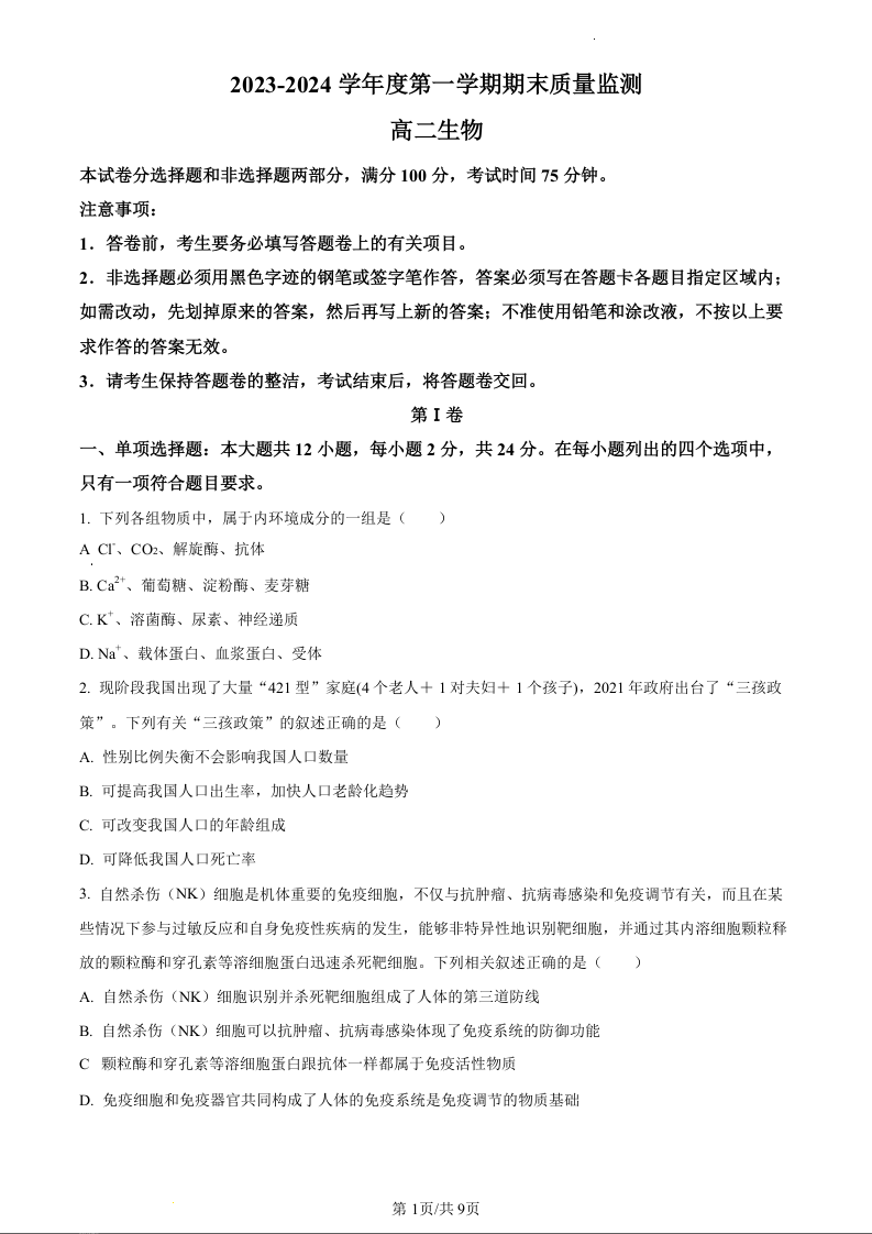 广东省茂名市电白区2023-2024学年高二上学期期末质量监测生物(原卷版)