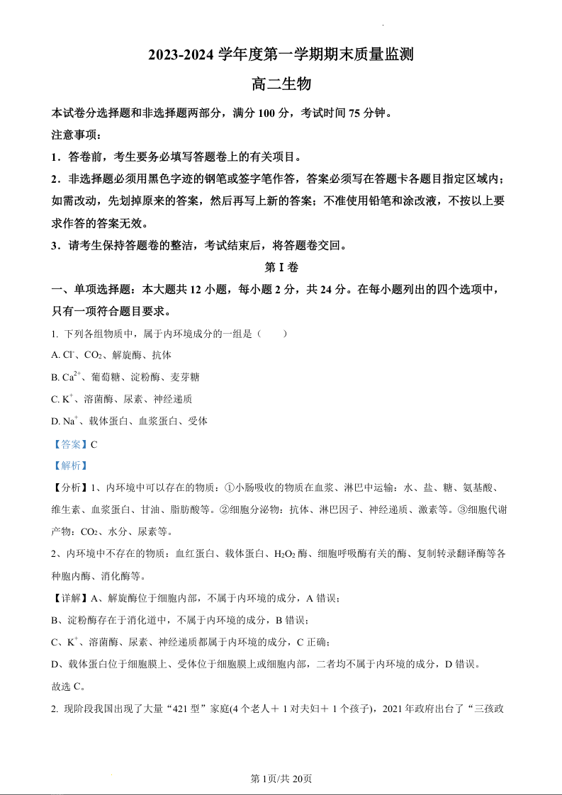 广东省茂名市电白区2023-2024学年高二上学期期末质量监测生物(精品解析版)