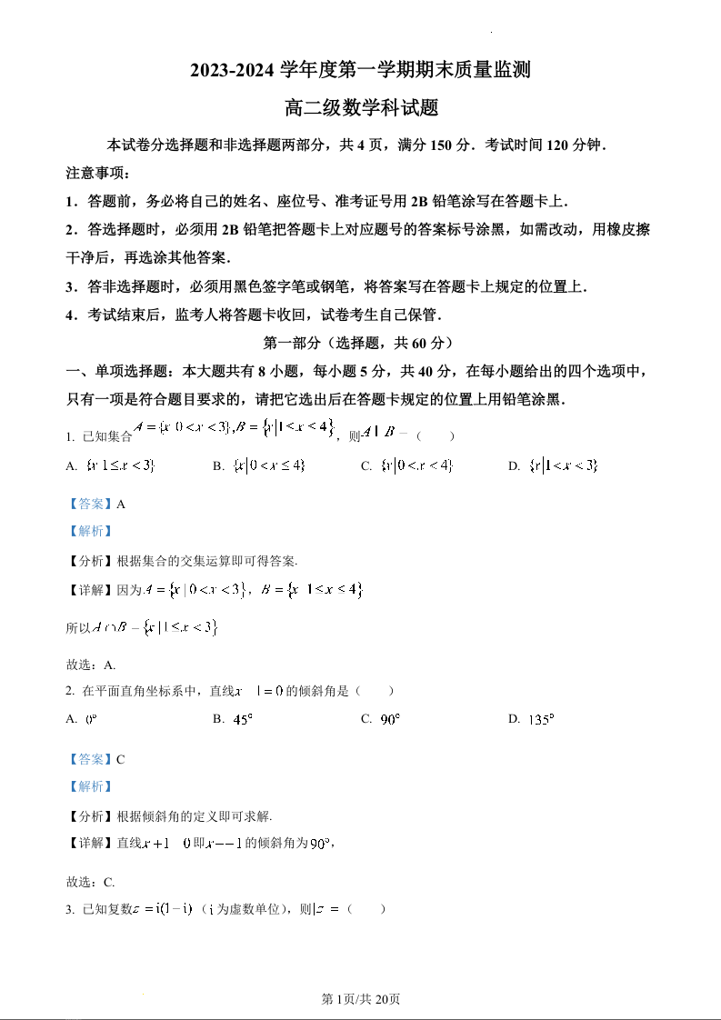 广东省汕头市澄海区2023-2024学年高二上学期期末考试数学(精品解析版)
