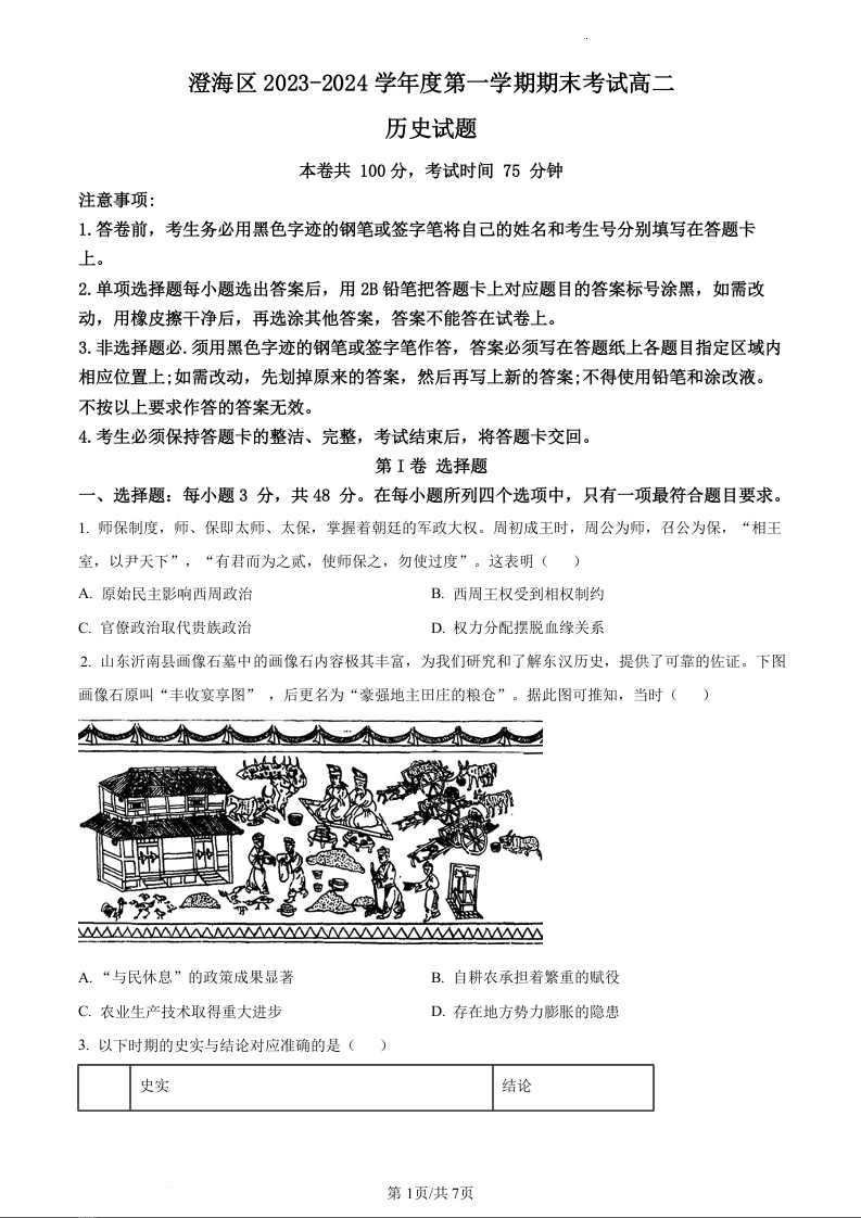 广东省汕头市澄海区2023-2024学年高二上学期期末考试历史(原卷版)