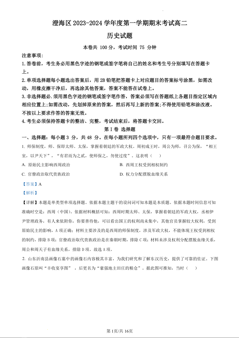 广东省汕头市澄海区2023-2024学年高二上学期期末考试历史(精品解析版)