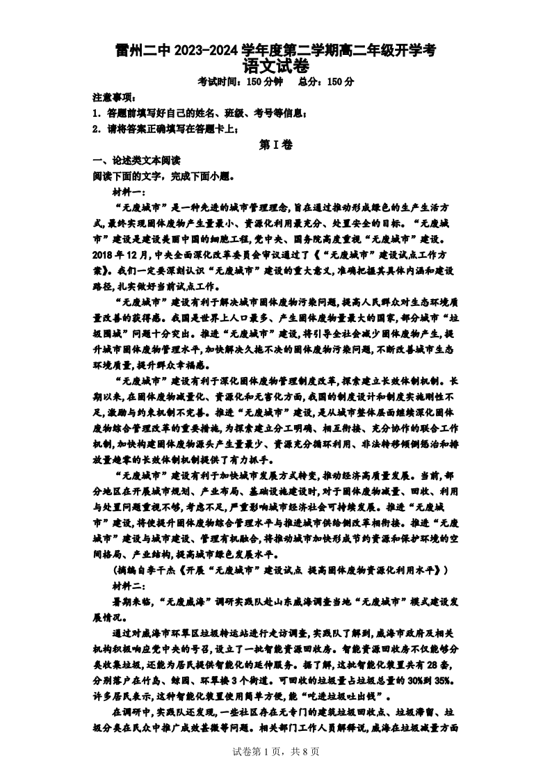 广东省湛江市雷州市第二中学2023-2024学年高二下学期开学考试语文