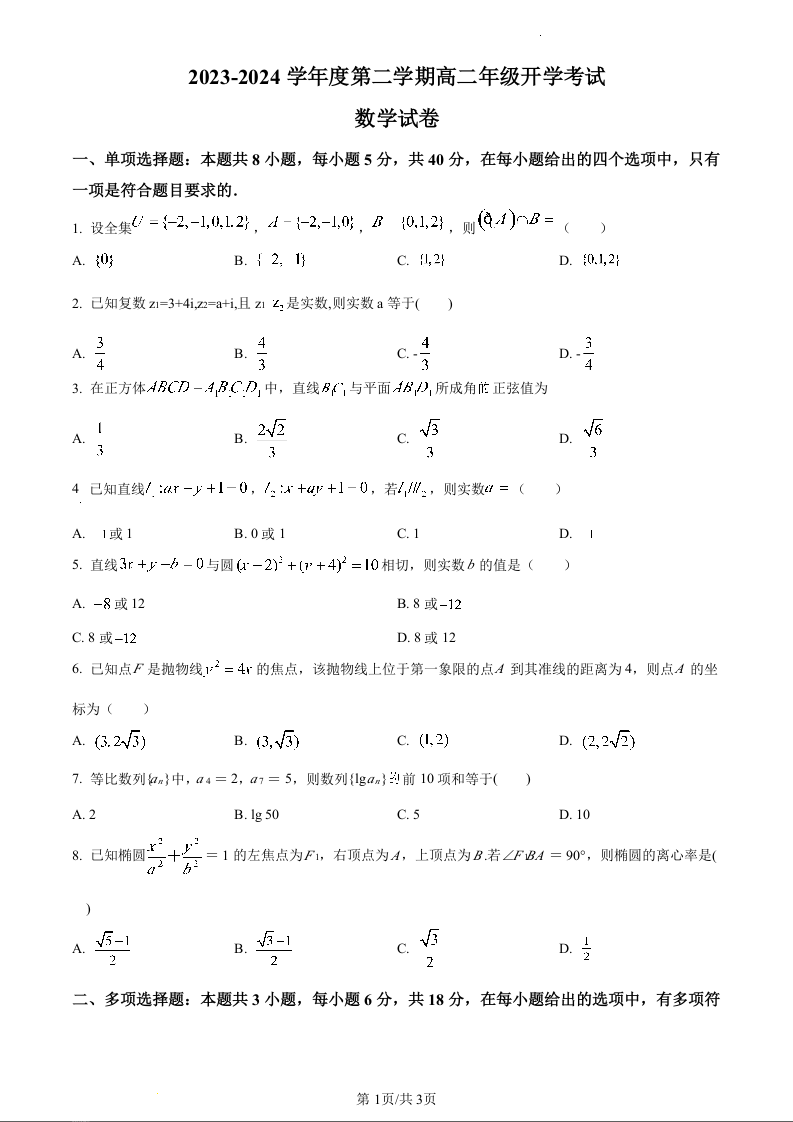 广东省湛江市雷州市第二中学2023-2024学年高二下学期开学考试数学(原卷版)