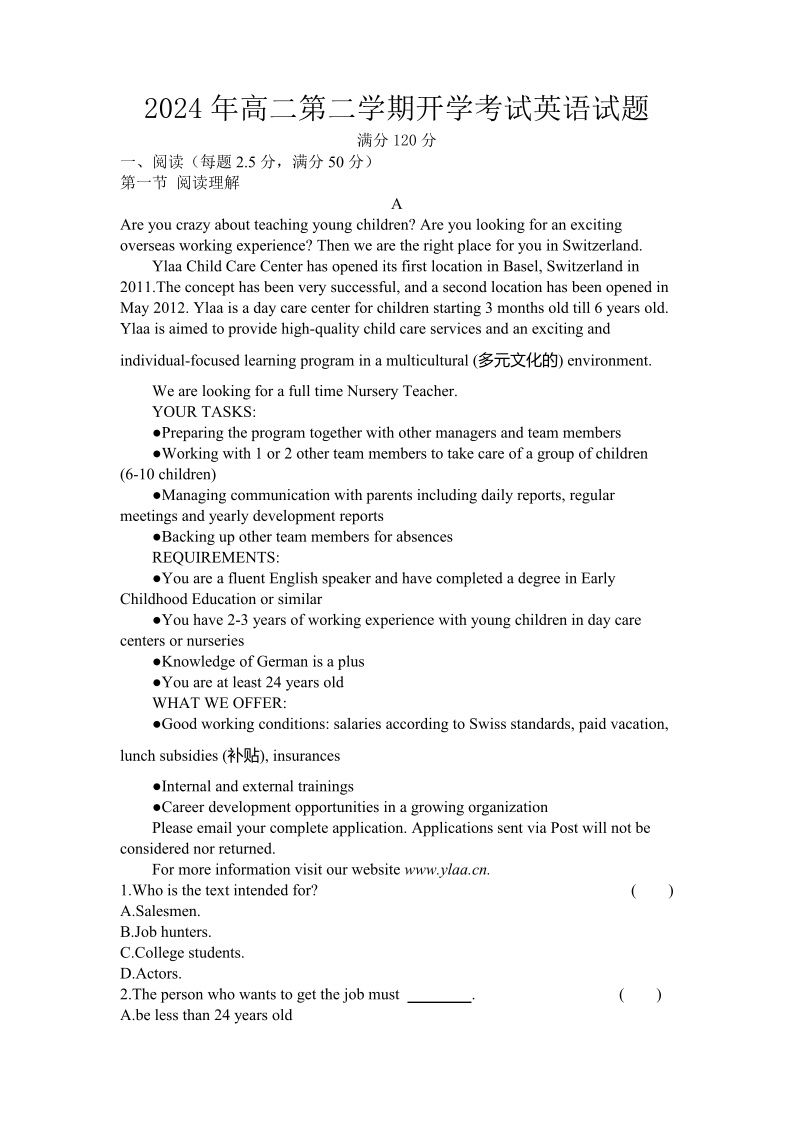 广东省湛江市雷州市第二中学2023-2024学年高二下学期开学考试英语