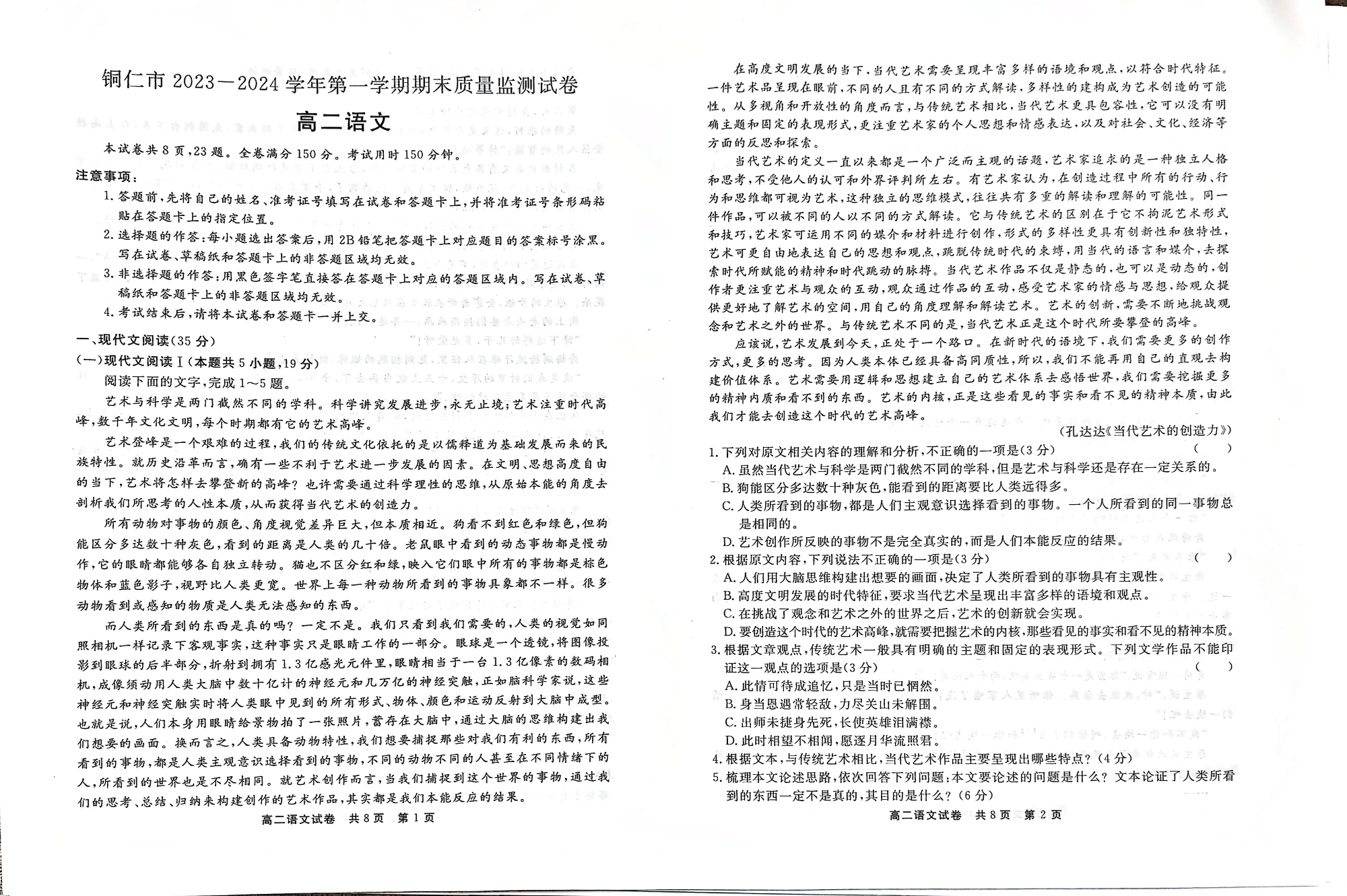 贵州省铜仁市2023-2024学年高二上学期期末考试语文