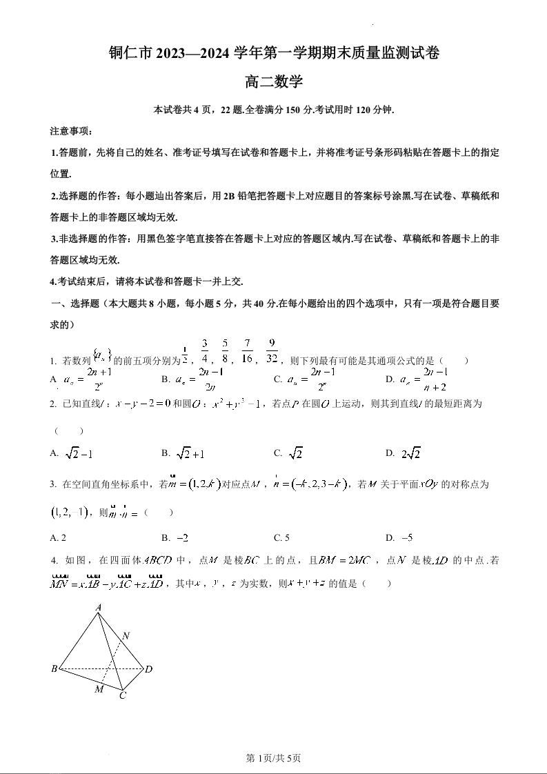 贵州省铜仁市2023-2024学年高二上学期期末考试数学(原卷版)