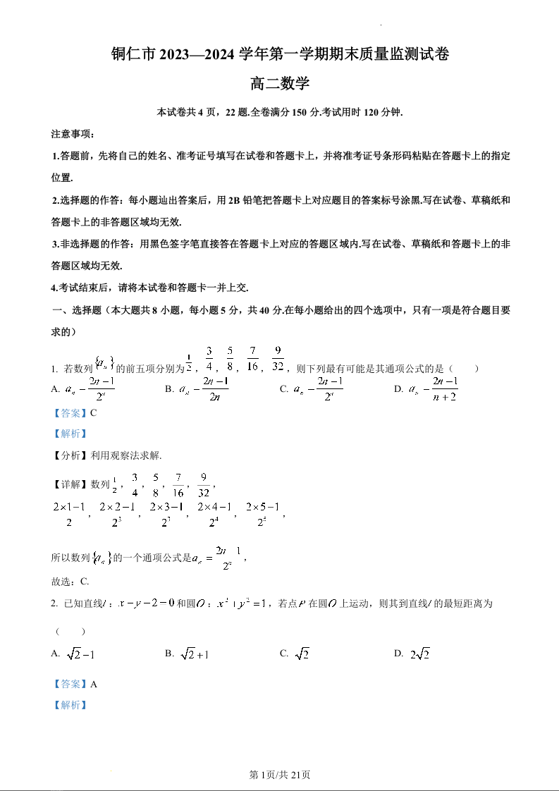 贵州省铜仁市2023-2024学年高二上学期期末考试数学(精品解析版)