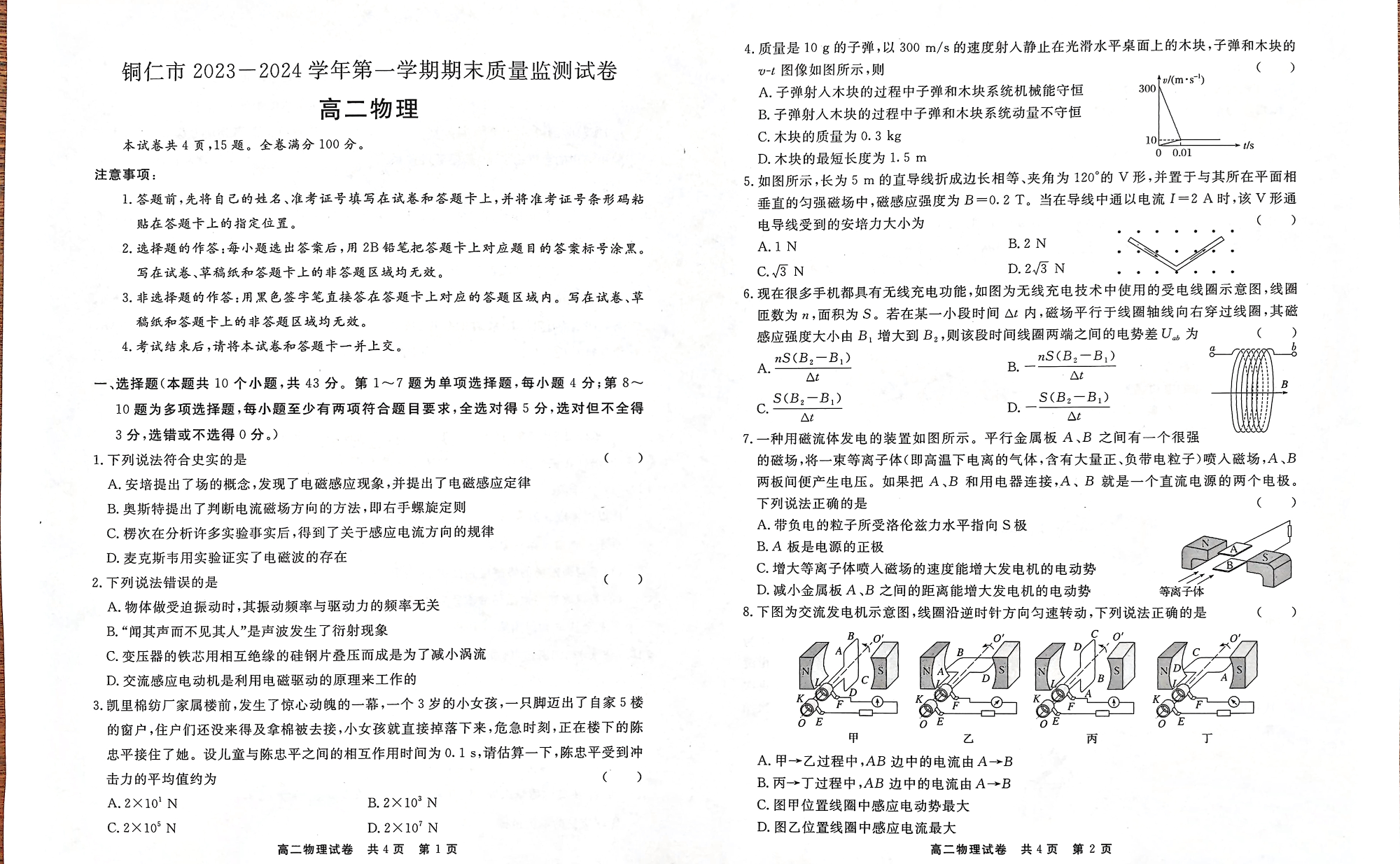 贵州省铜仁市2023-2024学年高二上学期期末考试物理
