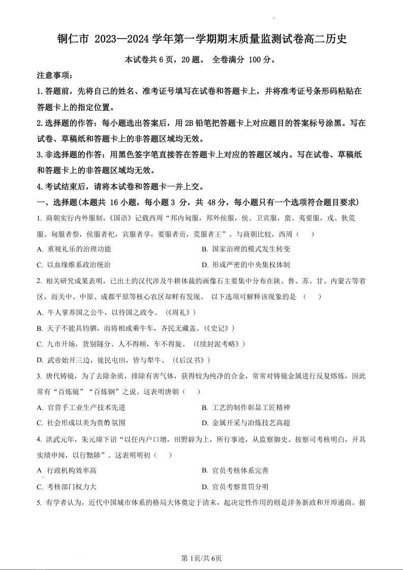 贵州省铜仁市2023-2024学年高二上学期期末考试历史(原卷版)