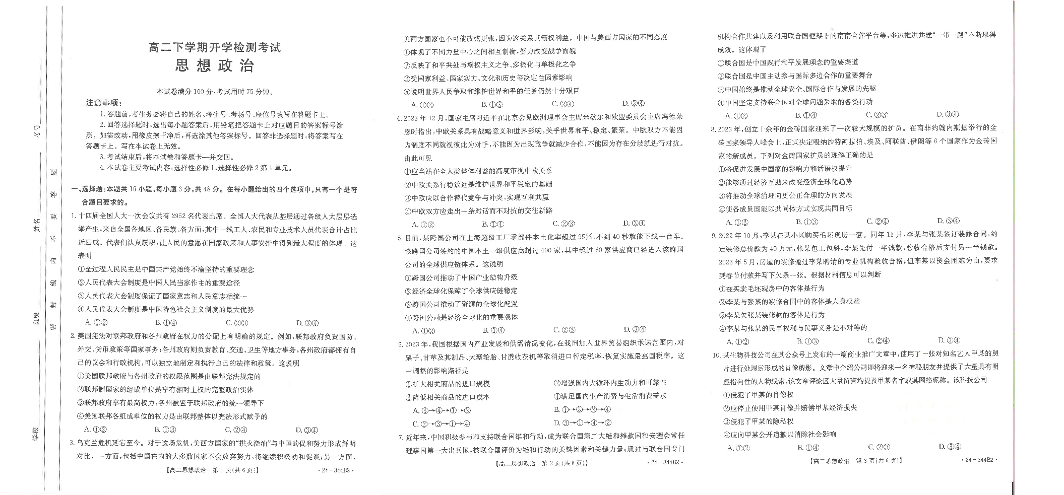 河北省保定市部分高中2023-2024学年高二下学期开学检测考试政治