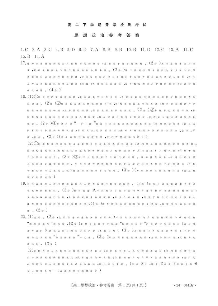 河北省保定市部分高中2023-2024学年高二下学期开学检测考试政治答案