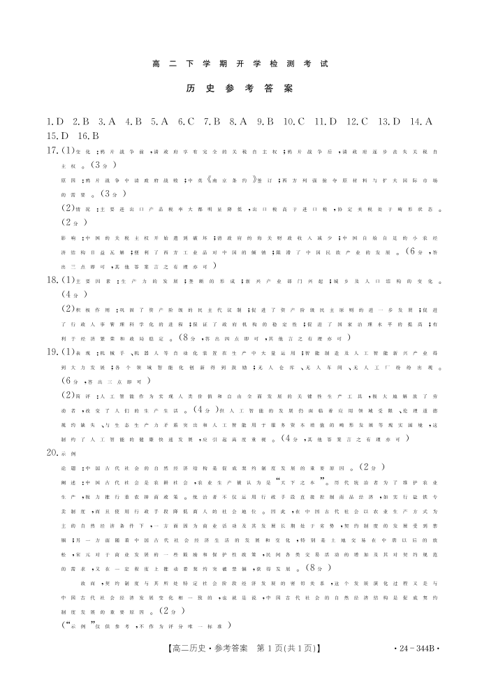 河北省保定市部分高中2023-2024学年高二下学期开学检测考试历史答案