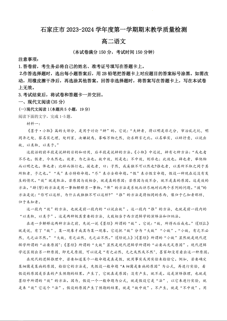 河北省石家庄市2023-2024学年高二上学期期末考试语文+答案