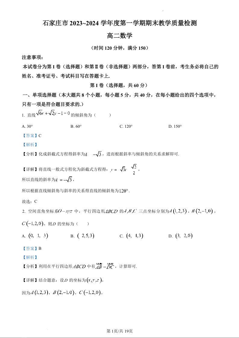 河北省石家庄市2023-2024学年高二上学期期末考试数学(精品解析版)