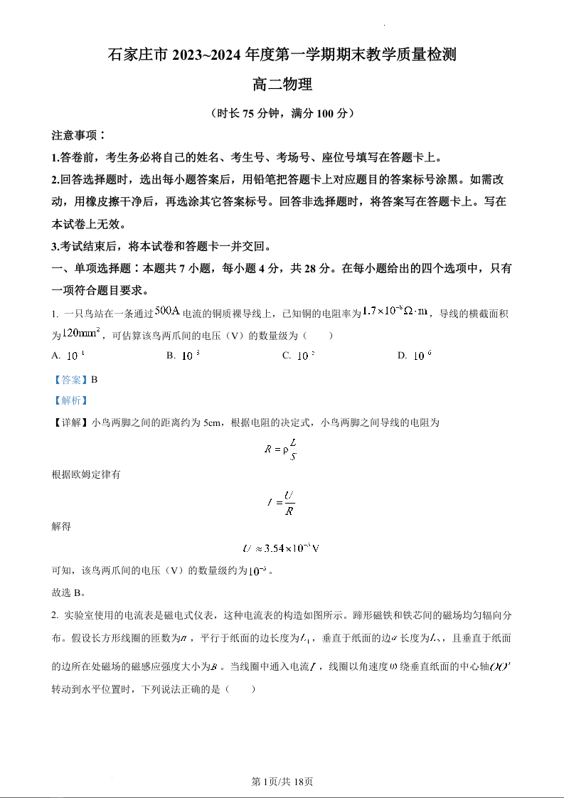 河北省石家庄市2023-2024学年高二上学期期末考试物理(精品解析版)
