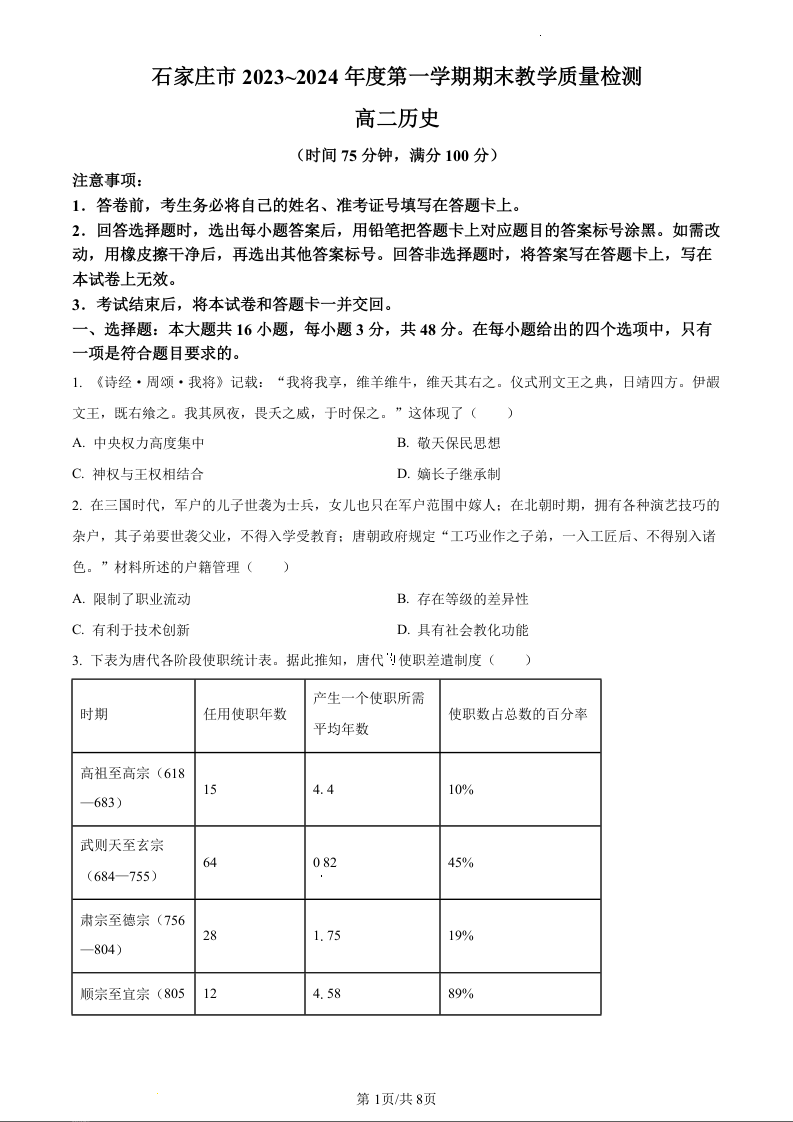 河北省石家庄市2023-2024学年高二上学期期末考试历史(原卷版)