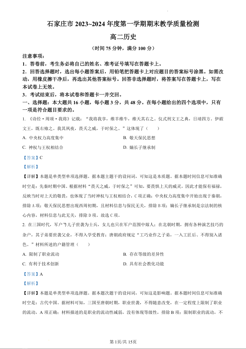 河北省石家庄市2023-2024学年高二上学期期末考试历史(精致解析版)