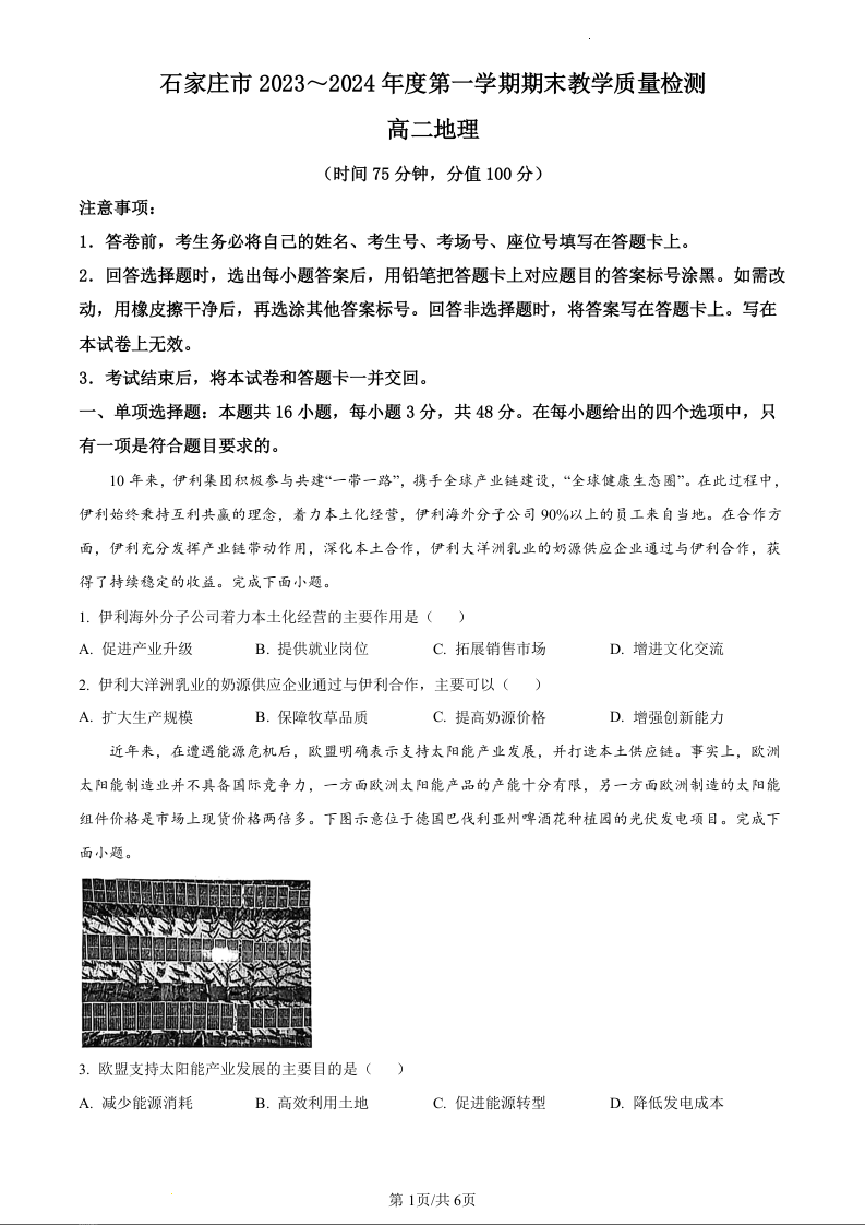 河北省石家庄市2023-2024学年高二上学期期末考试地理(原卷版)