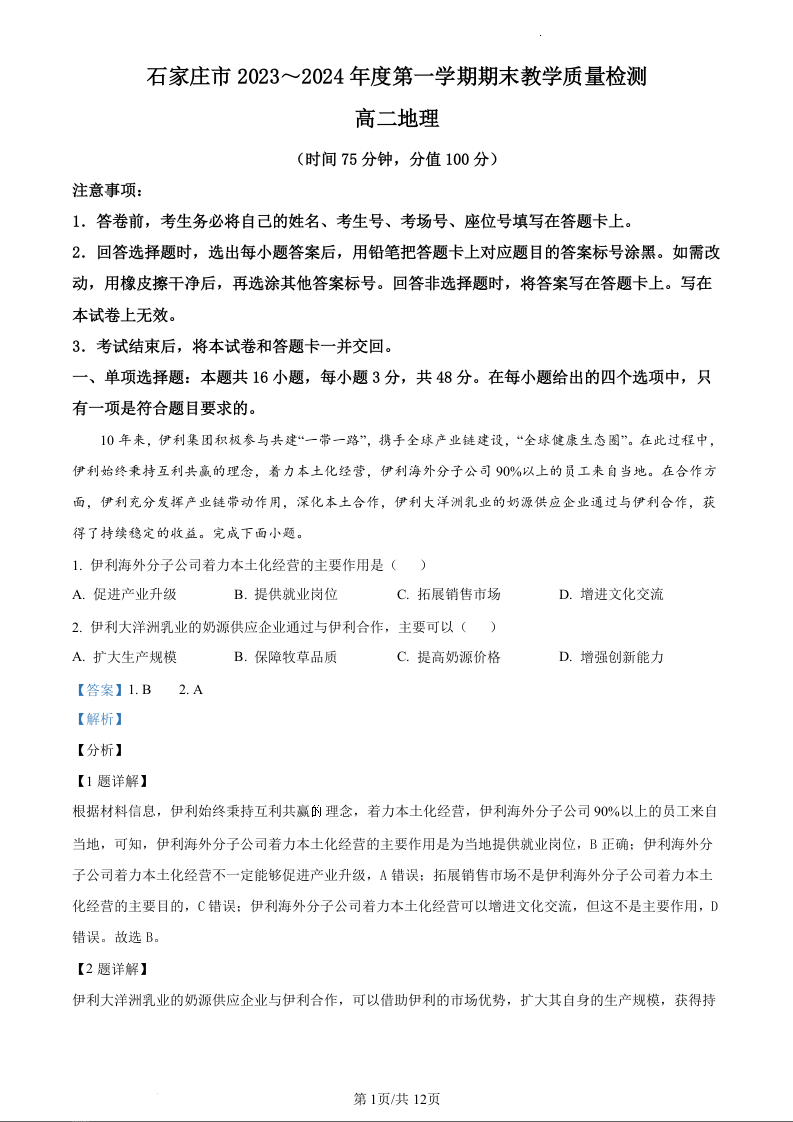 河北省石家庄市2023-2024学年高二上学期期末考试地理(精品解析版)