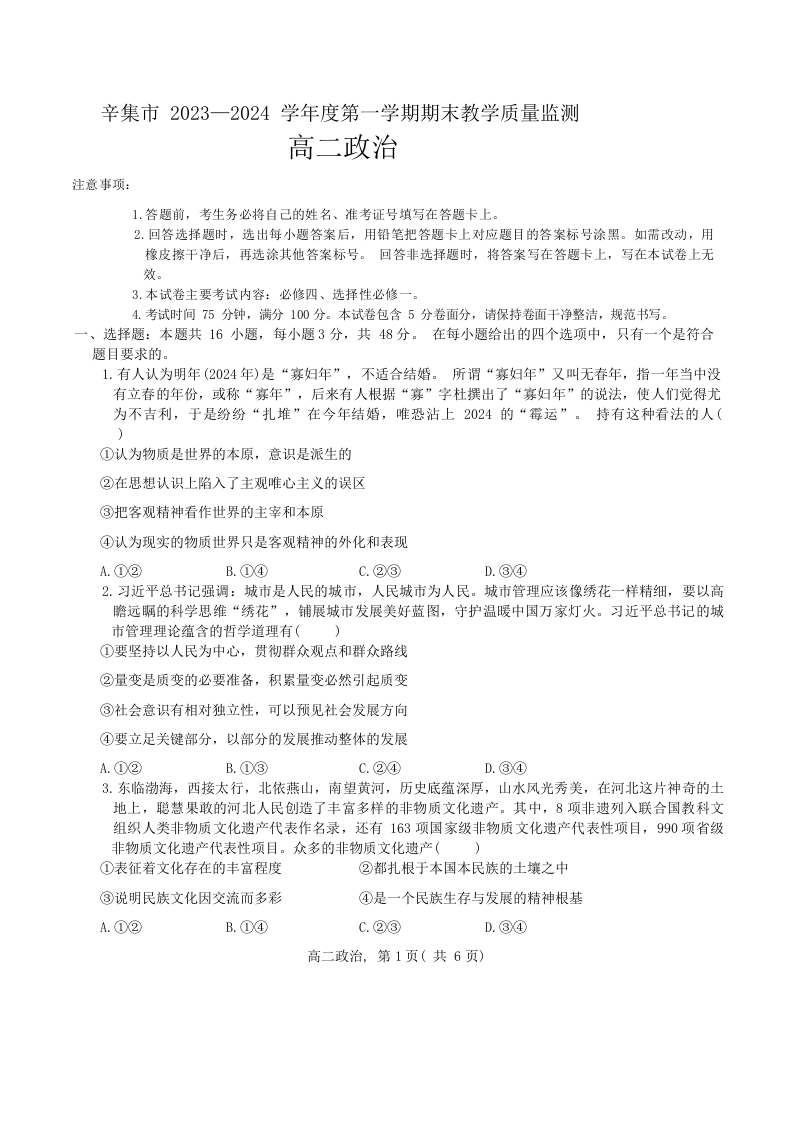 河北省石家庄市辛集市2023-2024学年高二上学期期末考试政治