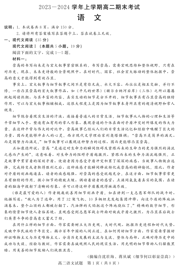 河北省邢台市2023-2024学年高二上学期1月期末联考语文