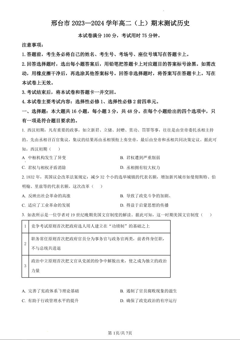 河北省邢台市2023-2024学年高二上学期1月期末联考历史(原卷版)