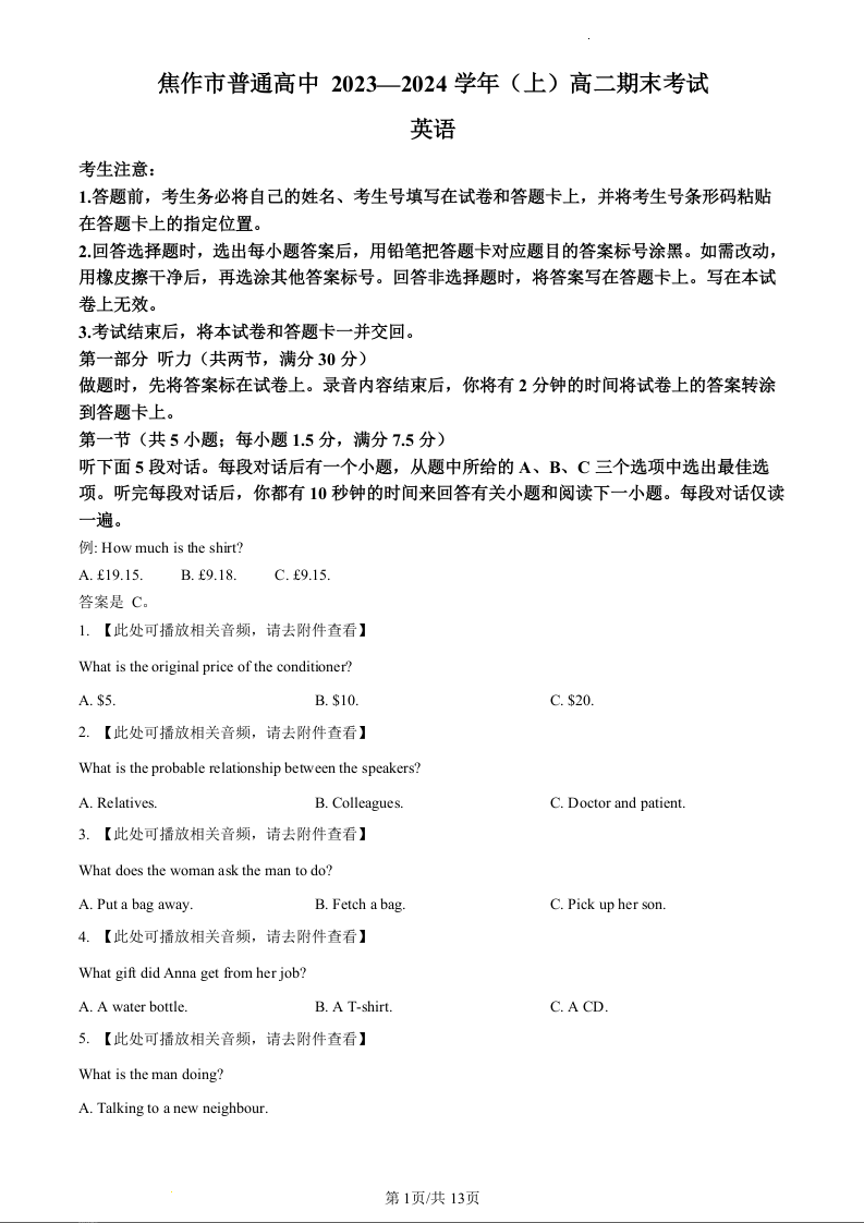 河南省焦作市2023-2024学年高二上学期1月期末考试英语(原卷版)