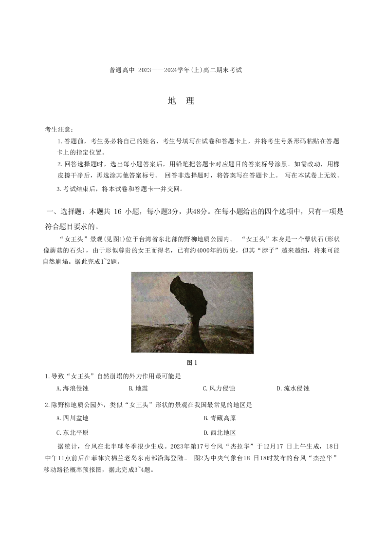 河南省焦作市2023-2024学年高二上学期1月期末考试地理