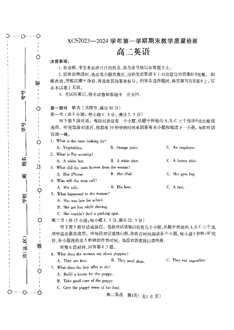 河南省许昌市2023-2024学年高二上学期期末考试英语