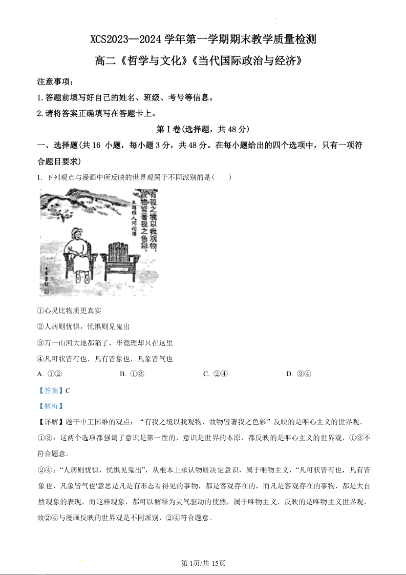 河南省许昌市2023-2024学年高二上学期期末考试政治(精品解析版)