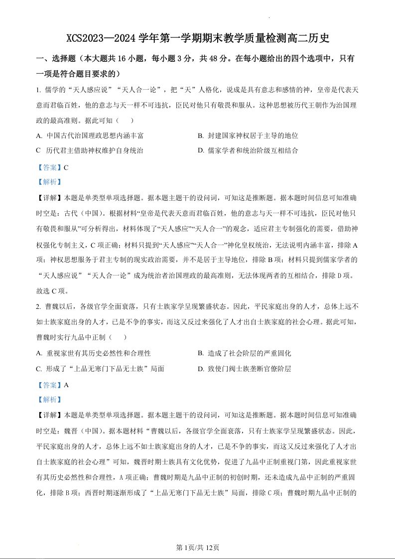河南省许昌市2023-2024学年高二上学期期末考试历史(精品解析版)