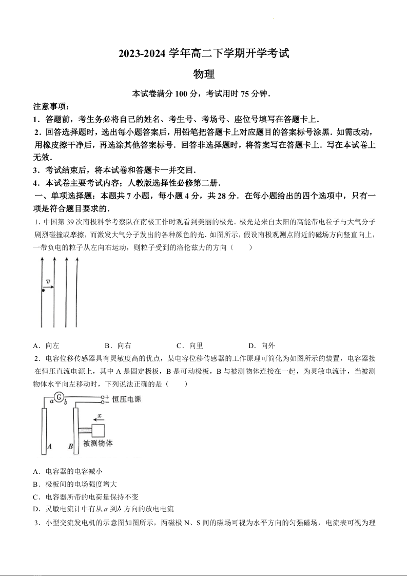 河南省许平汝名校2023-2024学年高二下学期开学考试物理+答案