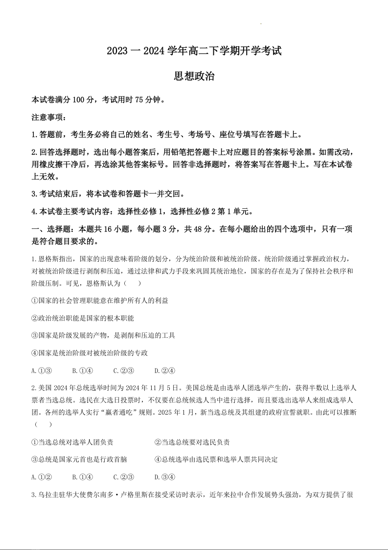 河南省许平汝名校2023-2024学年高二下学期开学考试政治+答案