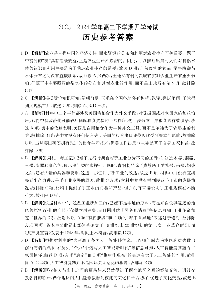 河南省许平汝名校2023-2024学年高二下学期开学考试历史答案