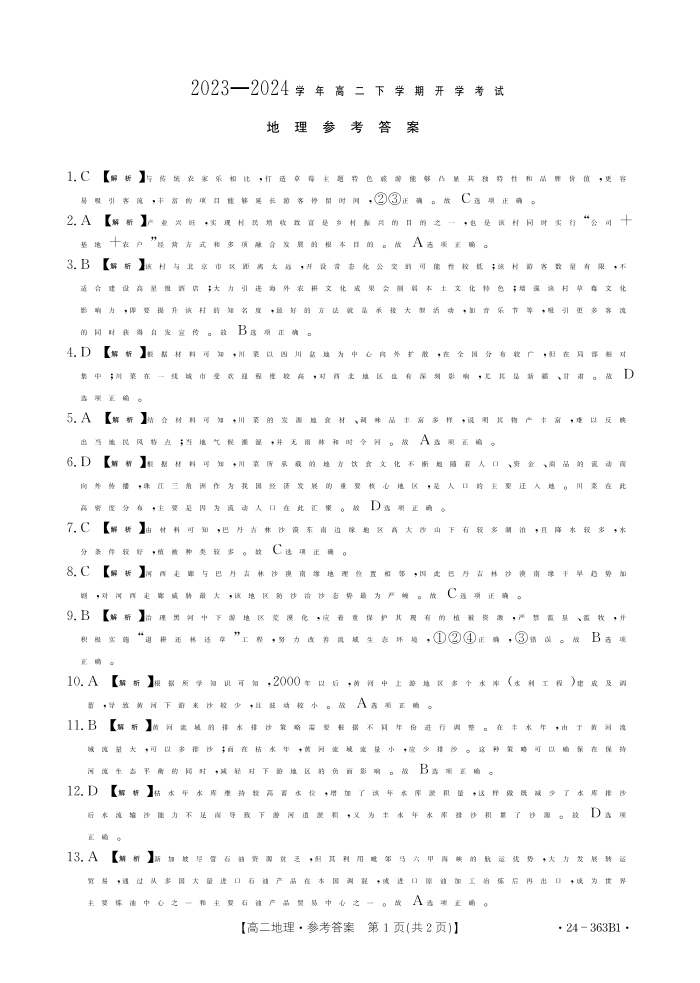 河南省许平汝名校2023-2024学年高二下学期开学考试地理答案