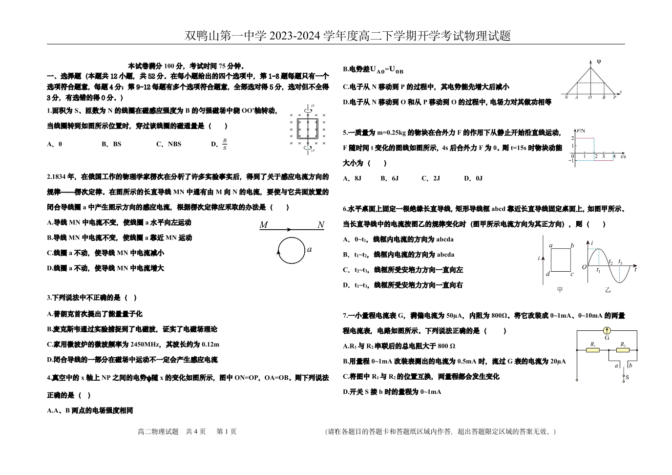 黑龙江省双鸭山市第一中学2023-2024学年高二下学期开学考试物理