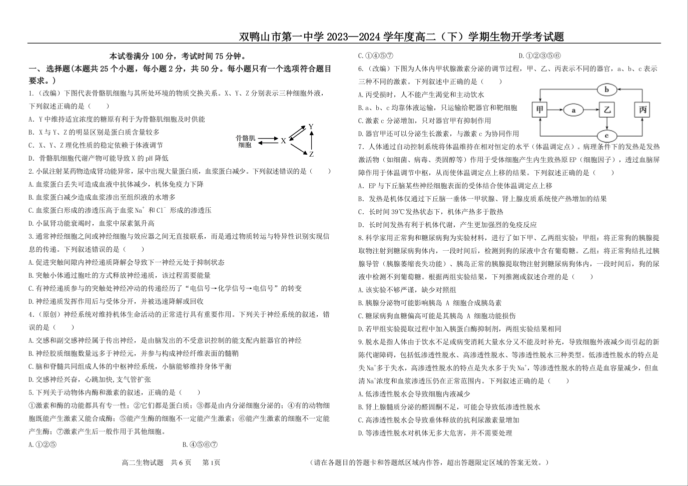 黑龙江省双鸭山市第一中学2023-2024学年高二下学期开学考试生物
