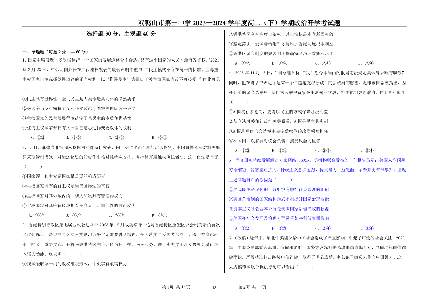 黑龙江省双鸭山市第一中学2023-2024学年高二下学期开学考试政治