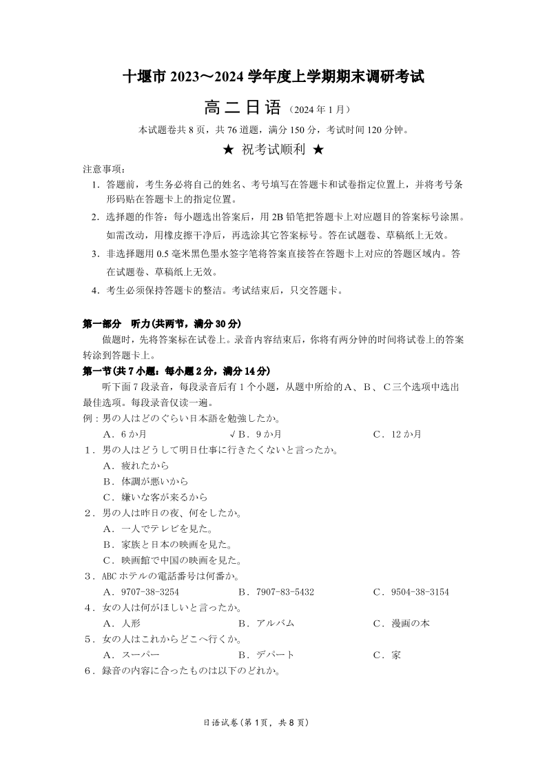 湖北省十堰市2023-2024学年高二上学期元月期末调研考试日语